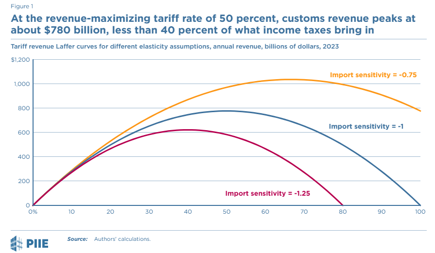 그림 1에서 수입 극대화 관세율이 50%일 때 관세 수입은 소득세가 가져오는 것의 40% 미만입니다. 다시 말하지만, 이 분석은 경제 성장에 미치는 부정적 영향을 무시하는데, 이는 50%의 일괄 관세율로 극적으로 나타나 수입을 상당히 감소시킬 것입니다.