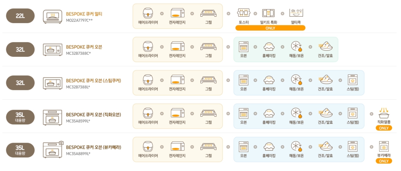 기능: 전자레인지, 에어프라이어, 그릴, 오븐, 홈베이킹, 해동/보온, 건조/발효, 스팀(찜), 직화열풍 or 뷰카메라
